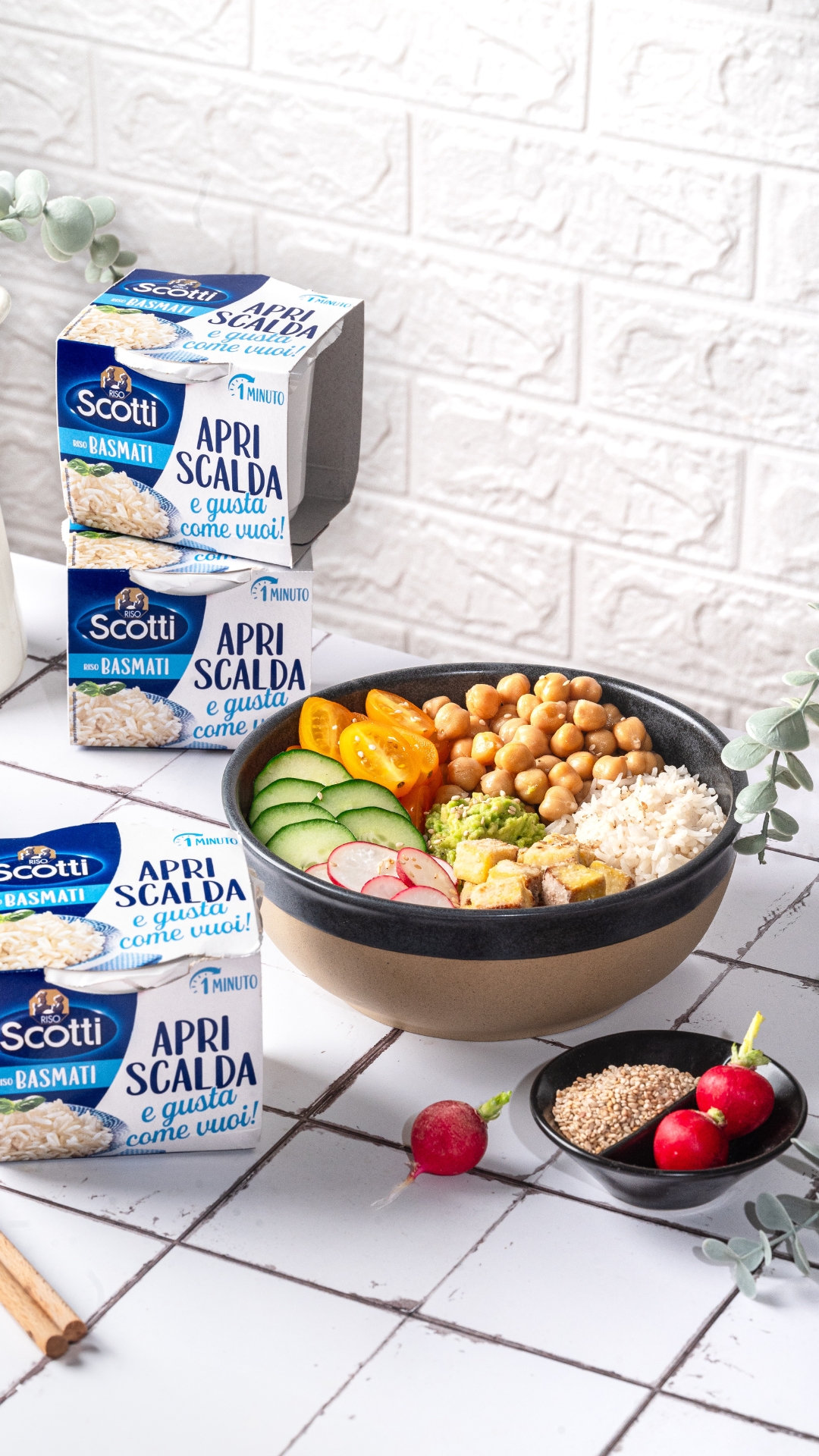 Per prima cosa procedere alla preparazione del riso basmati Scotti Apri scalda e gusta seguendo le indicazioni presenti sulla confezione.